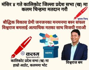कालिकाेट असाेज २४ नेपाल कम्युनिष्ट पाटि एकिकृत समाजबादि कालिकाेटका अध्यक्ष बिश्वराज बमले प्रदेश ख निर्वाचन क्षेत्रबाट प्रदेश सदस्यका लागि उम्बेदारि दर्ता गर्नु भएकाे छ ।